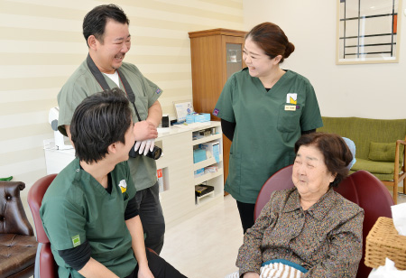 在宅や施設等で療養を行っており、通院による歯科診療が困難な方は、十分な歯科治療やお口のケアを受けられず、虫歯や歯周病などの病気の進行だけでなく、入れ歯の不調などによる食事困難、嚥下機能の低下、発音障害などを引き起こしてしまいます。そのような方々の施設やお宅まで直接歯科医師と歯科衛生士でお伺いし、歯科医院と同様の治療とケアを行います。患者さまにご負担のない体勢で治療を受けていただくことが可能です。